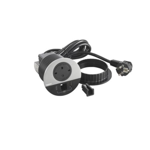 Incara Disq 80 - bútorba süllyeszthető 2P+F + USB A+C + kábelkivezető aljzat, 2m kábellel, alumínium