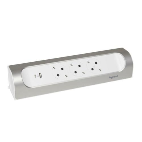 Sarokba illeszkedő elosztósor, 3x2P+F, USB-A + USB-C, vezeték nélkül, fehér-alumínium